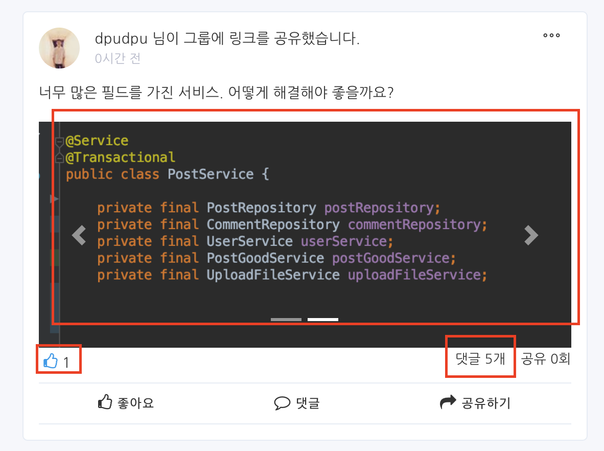 PostService는 현재 PostRepository, PostGoodService, UserService, CommentRepository, UploadFileService 이렇게 5개의 필드를 의존하고 있습니다.