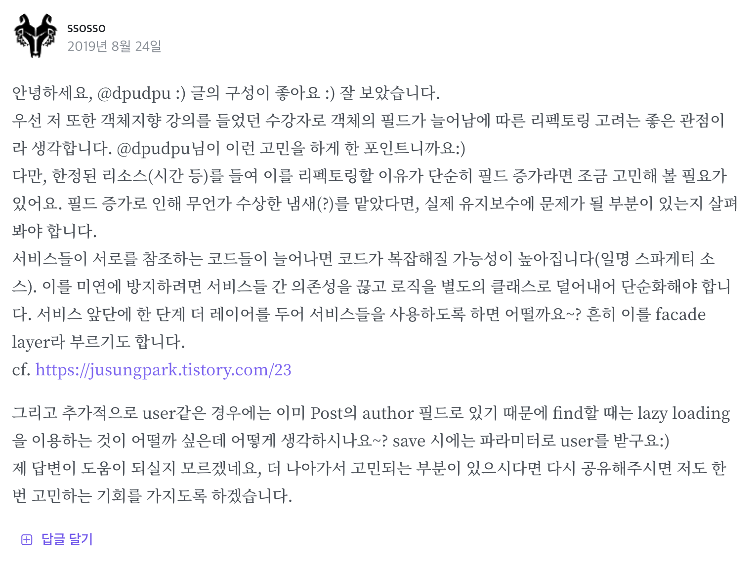 그리고 댓글(Comment), 좋아요(PostGood)에서 Post를 단방향으로 의존하고 있습니다.