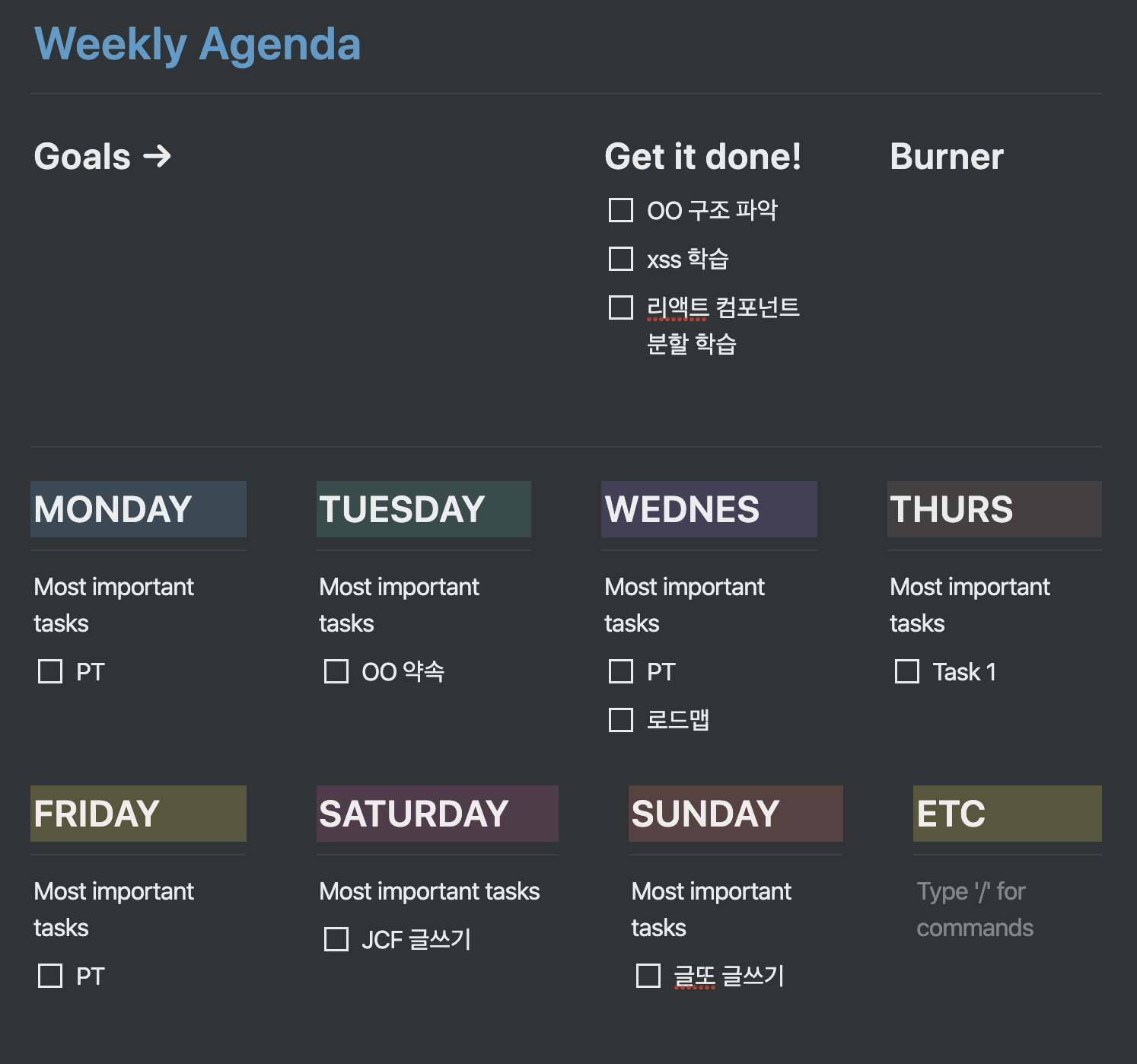 기존에는 태스크 관리를 노션으로 했다. 내용을 보면 목표가 불분명하고 단위가 너무 크다. e,g. Redis 공부, 글또 글쓰기