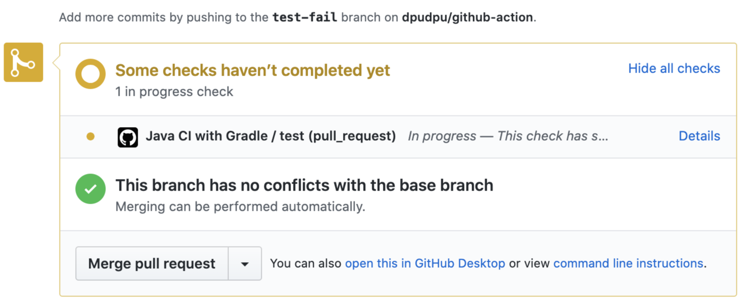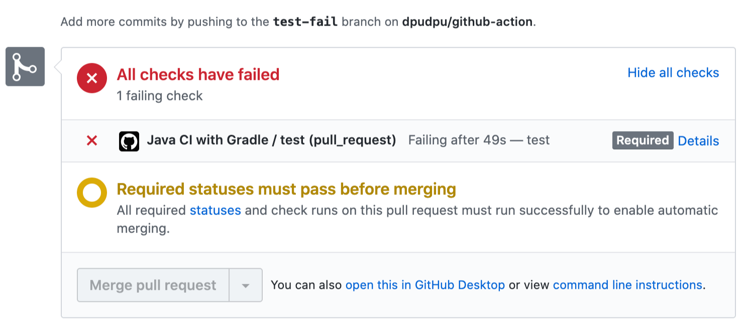 위처럼 CI가 실행 중이거나, 실패한 경우 merge가 되면 안 됩니다.