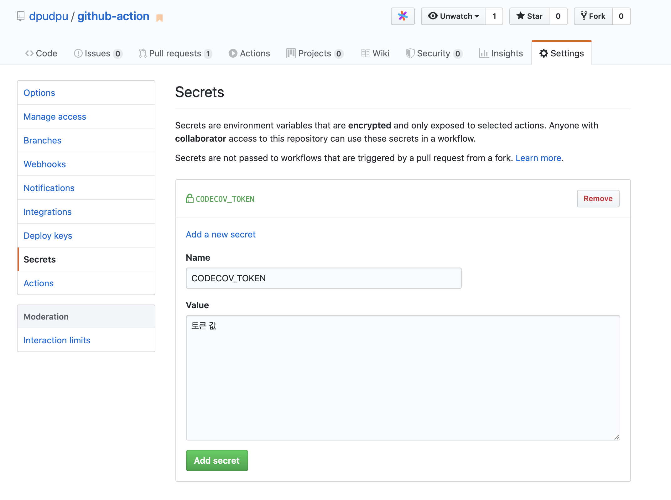 github secrets에 Token 추가