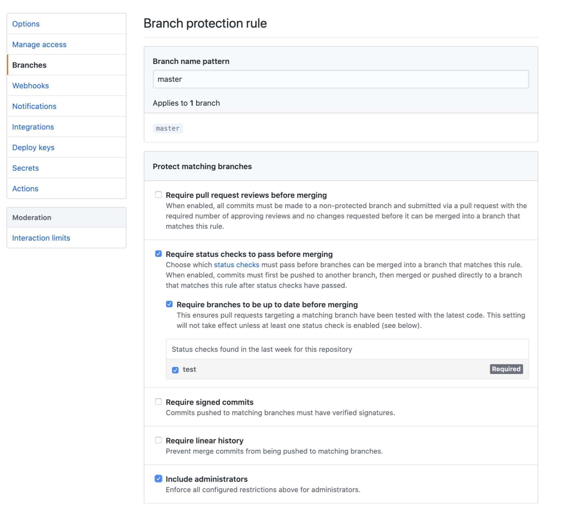 tip: develop과 master를 하나의 rule에서 함께 적용하고 싶으면 Branch name pattern에 [dm][ea][vs][!o]*를 입력하면 됩니다.