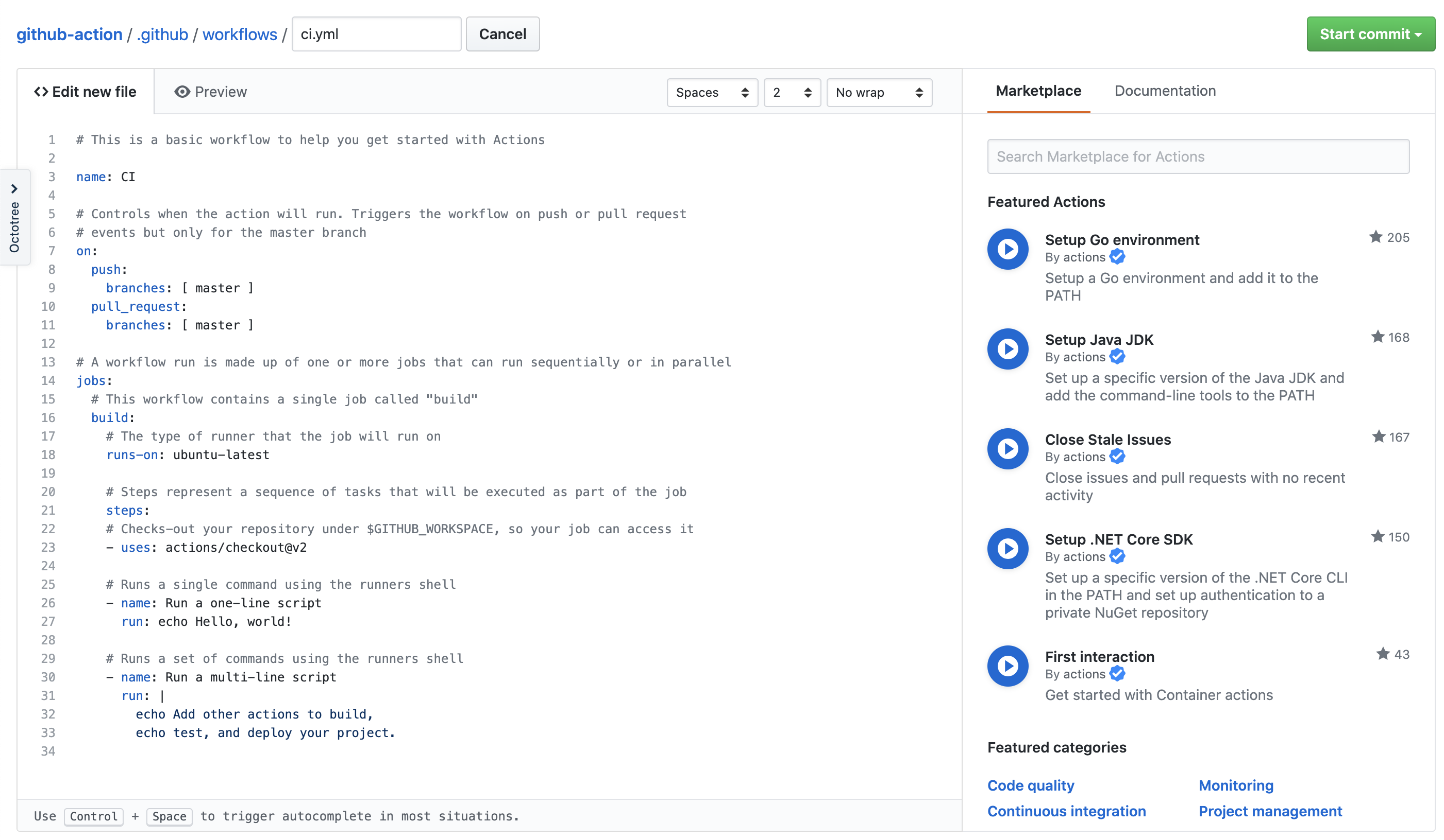 액션은 워크플로우 안의 개별 태스크입니다. 직접 만들 수도 있고 마켓플레이스에 공유된 액션을 사용할 수도 있습니다. 공유된 액션을 사용하면 직접 구현하지 않고 편하게 이용할 수 있습니다. e.g. JDK 설정, AWS 설정 등이 있습니다.