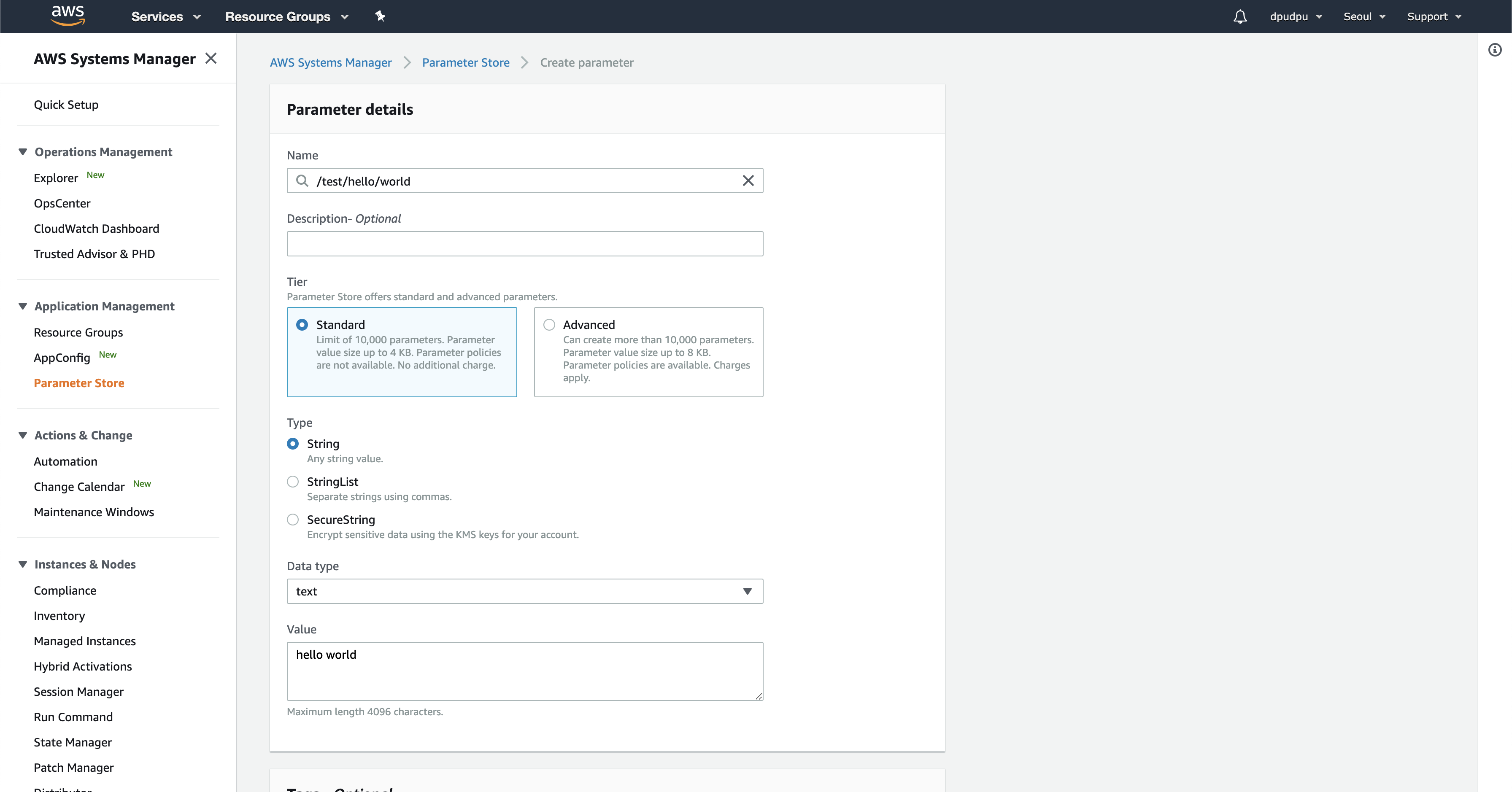 파라미터 생성은 정말 간단합니다. Name, Value, Type만 설정하면 되며 Name은 슬래시(/)를 사용하여 계층 구조를 이루는 것을 추천합니다. 이유는