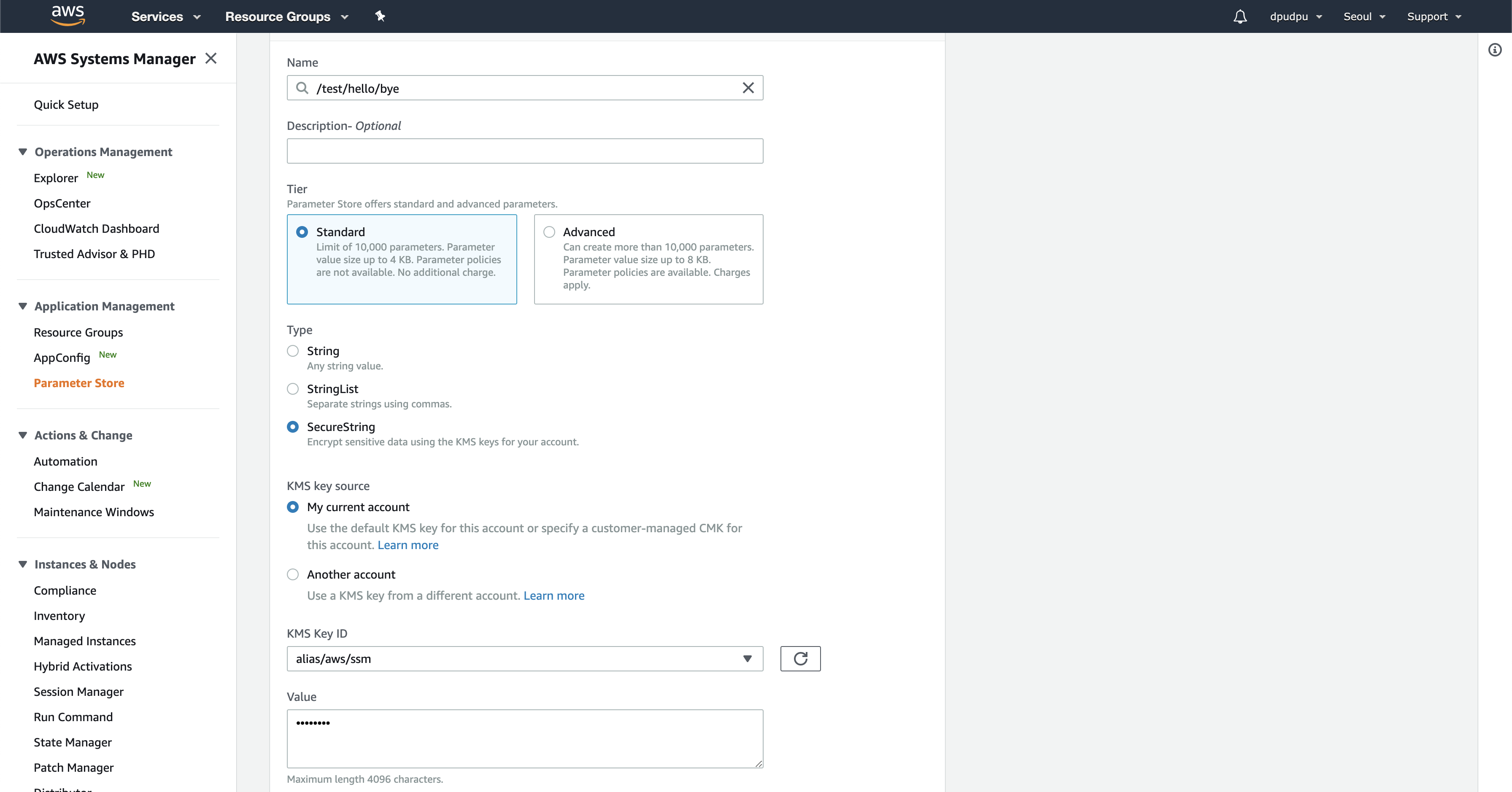 중요한 데이터를 저장할 때는 SecureString 사용을 권장합니다. SecureString을 이용하면 Parameter Store에서 AWS Key Management Service(KMS) Customer Master Key(CMK)를 사용하여 파라미터 값을 암호화합니다.