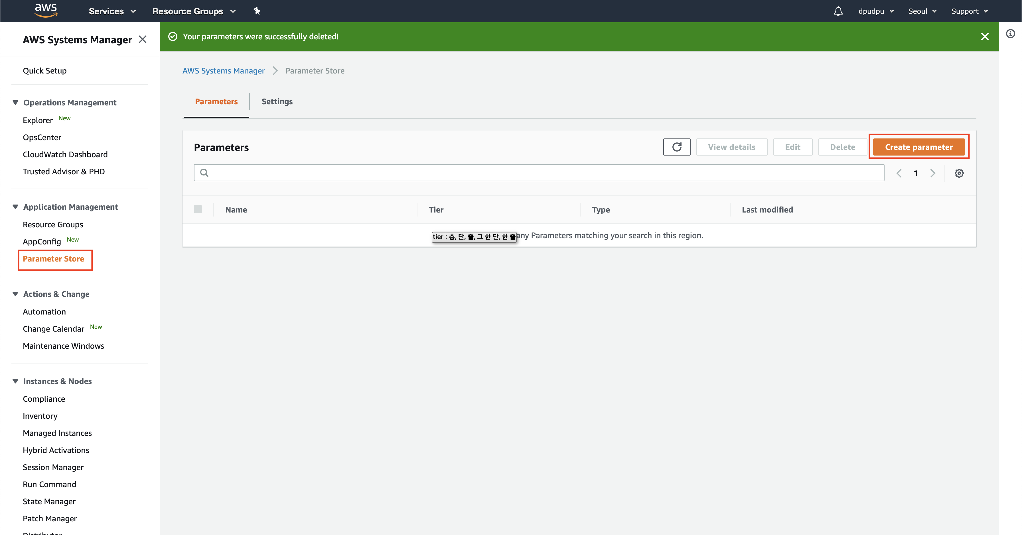 Systems Manager -> Parameter store 에서 생성할 수 있습니다.