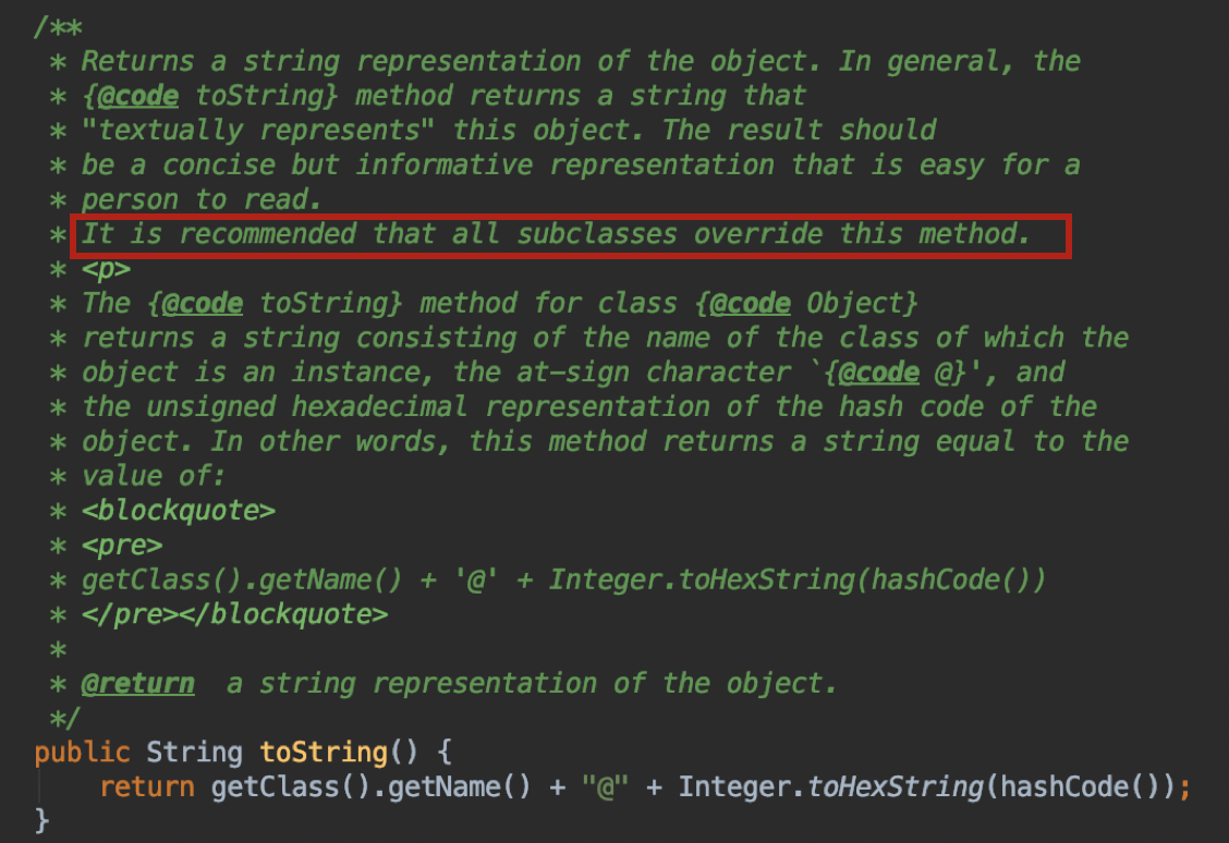 - 오류 메시지를 로깅할 때 자동으로 호출할 수 있다. (toString을 제대로 재정의하지 않는다면 쓸모없는 메시지만 로그에 남을 것이다.